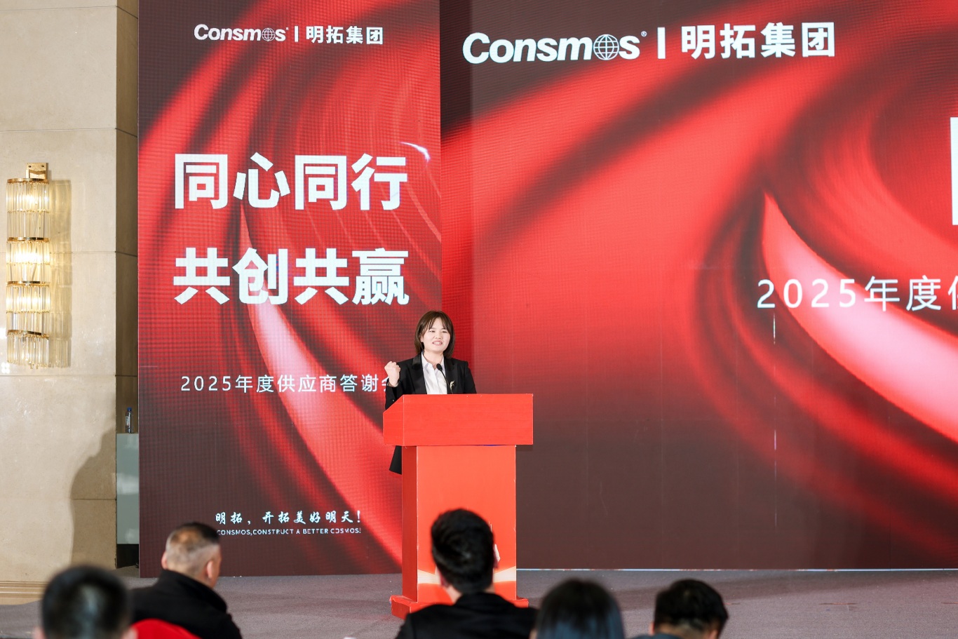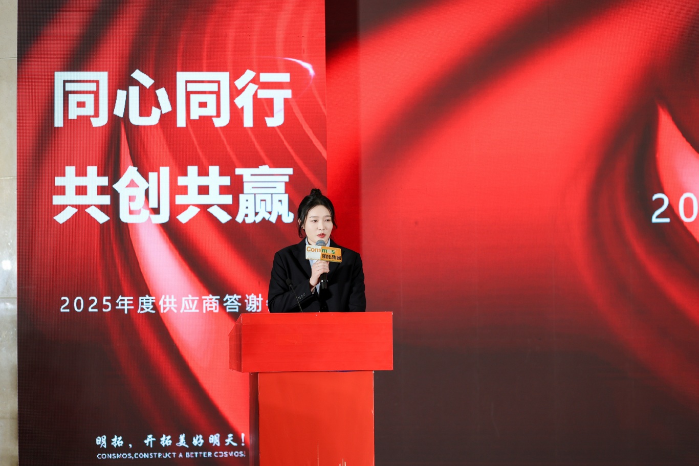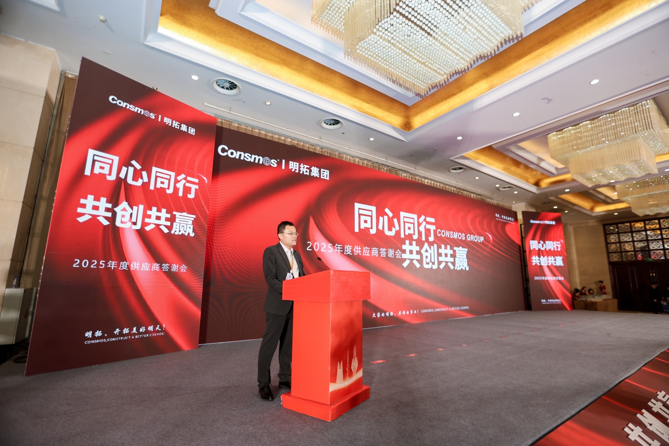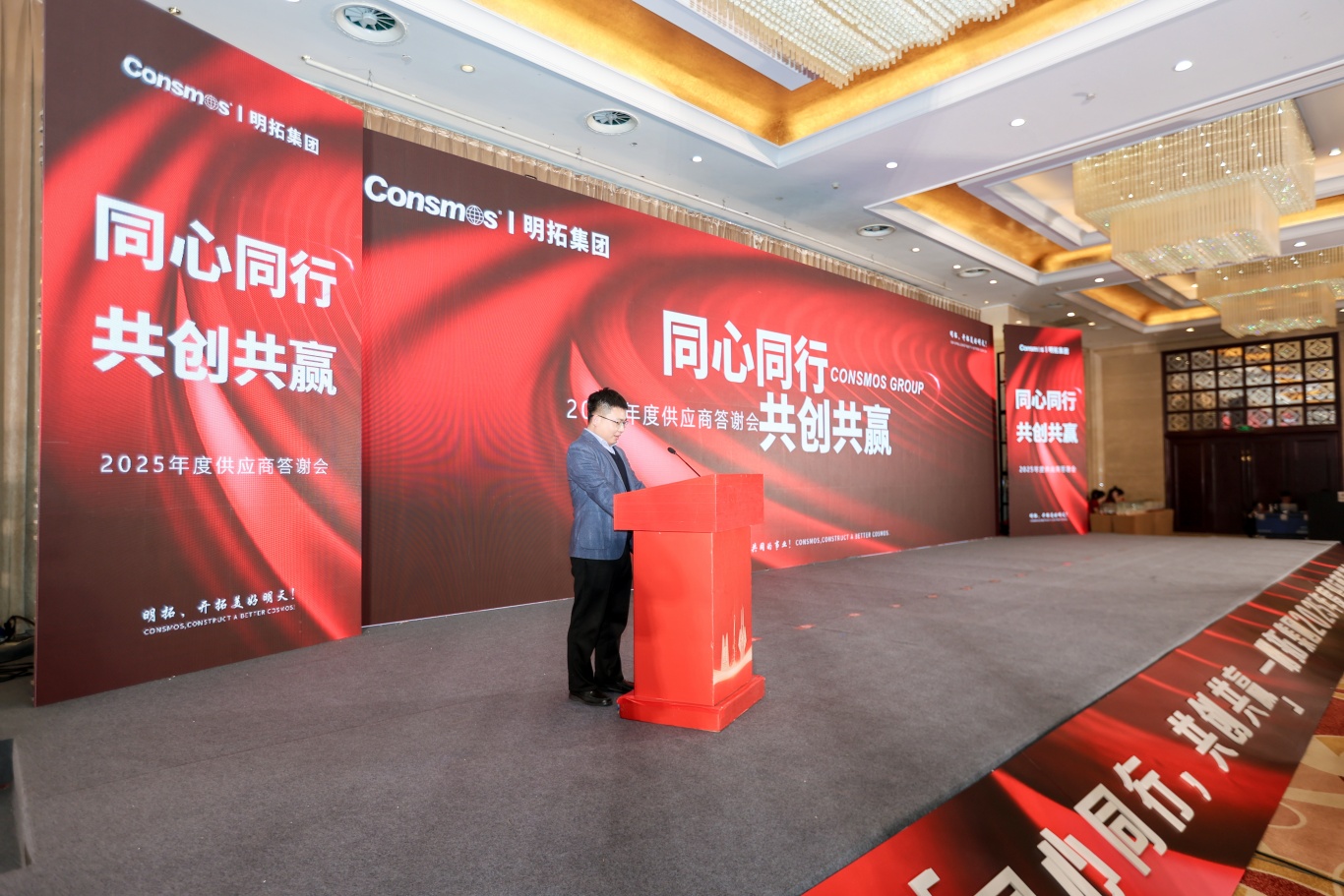 随后,供应商伙伴们移步沂河宾馆会场,纷纷在主题签到墙、打卡区前驻足签字、合影留念。工作人员为每位到场伙伴送上了精心准备的伴手礼 —— 寓意吉祥顺利的精美摆件与 CONSMOS 定制红酒,一份份心意满载着明拓对合作伙伴的感恩之情,温馨的布置与贴心的服务,让整场活动从一开始就充满了团圆与信赖的氛围。