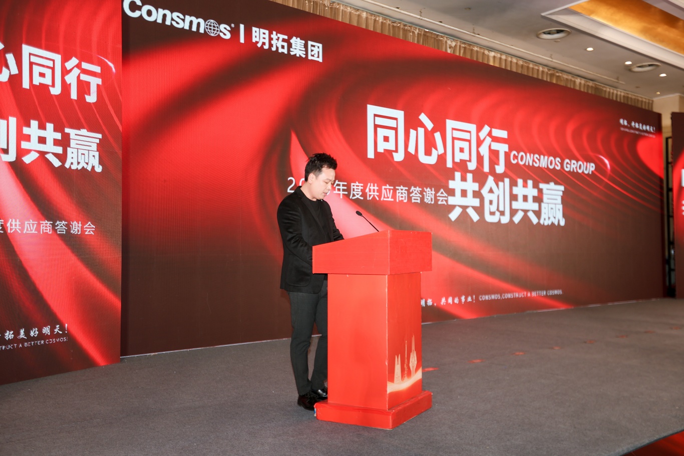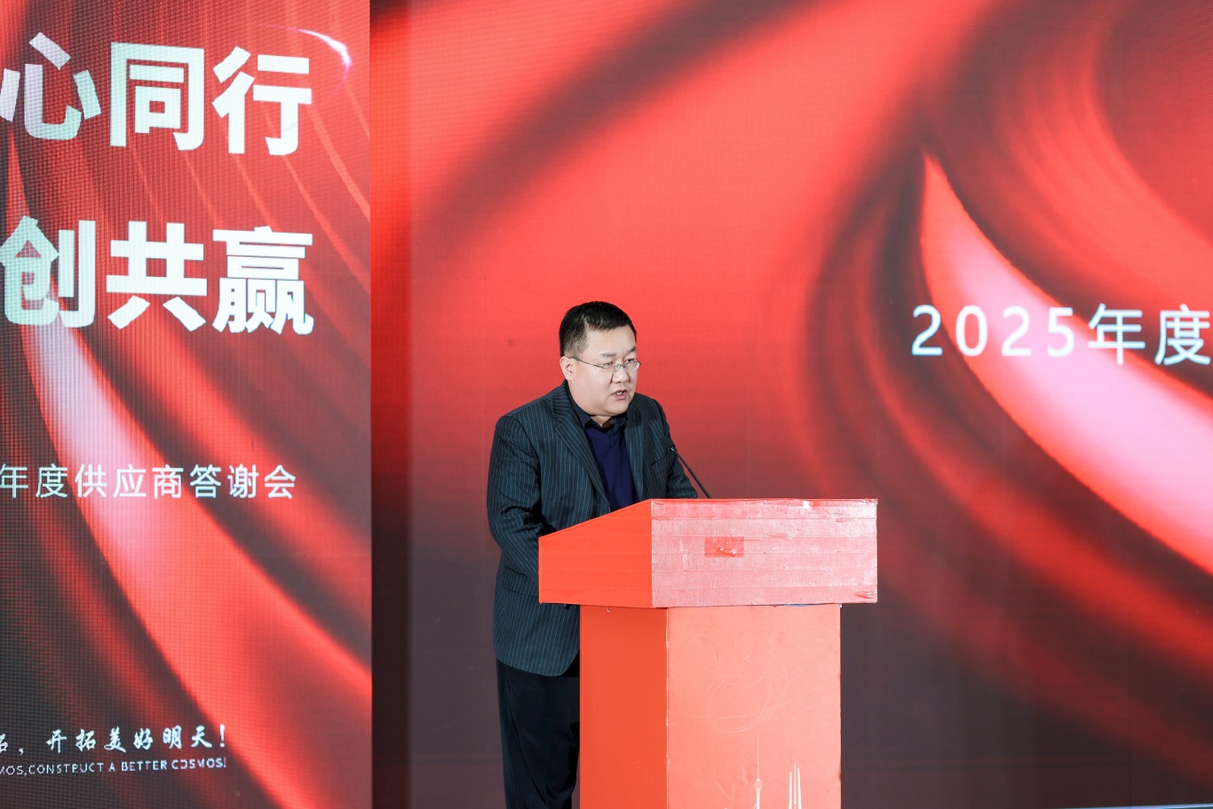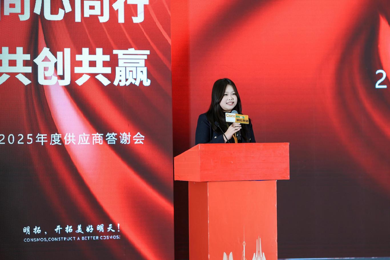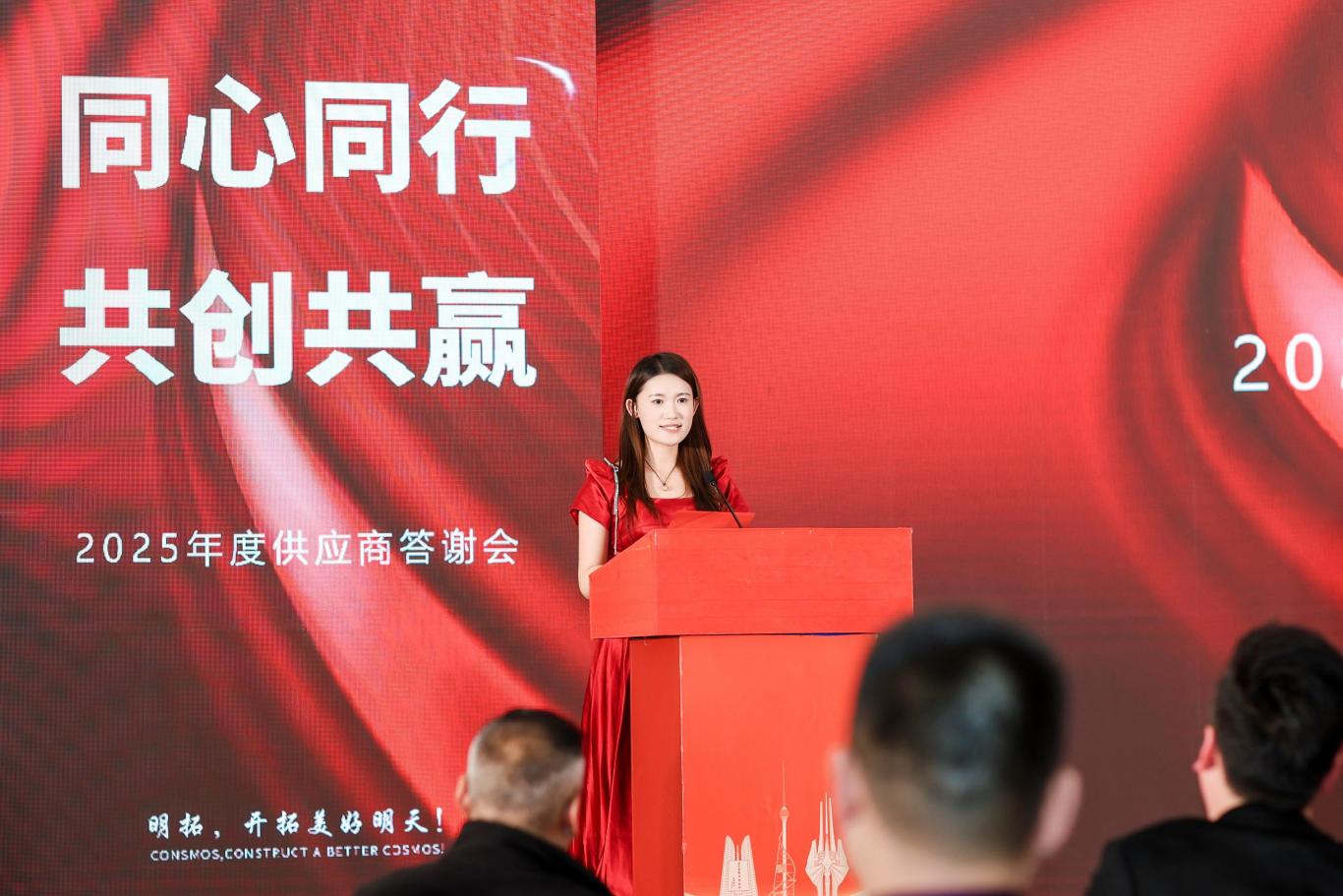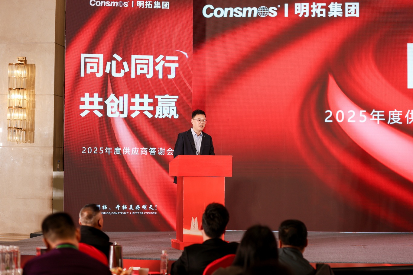 随后,供应商伙伴们移步沂河宾馆会场,纷纷在主题签到墙、打卡区前驻足签字、合影留念。工作人员为每位到场伙伴送上了精心准备的伴手礼 —— 寓意吉祥顺利的精美摆件与 CONSMOS 定制红酒,一份份心意满载着明拓对合作伙伴的感恩之情,温馨的布置与贴心的服务,让整场活动从一开始就充满了团圆与信赖的氛围。